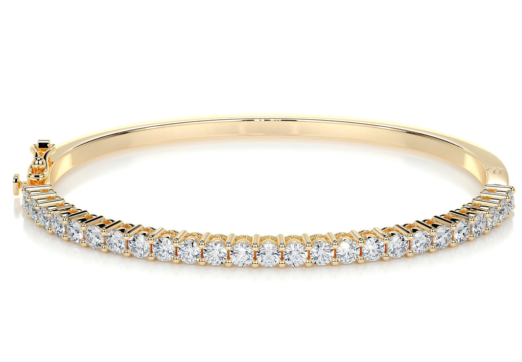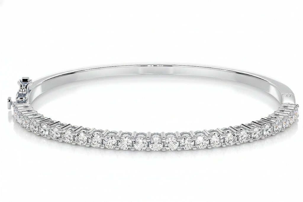 Timeless Glamour for Your Wrist Elevate your jewelry collection with our Moissanite Half-Eternity Bangle. This sophisticated piece features a stunning row of brilliant-cut Moissanite stones set halfway across a high-polish band, offering a perfect balance of dazzling sparkle and sleek metal. It is the ultimate statement of luxury for any occasion.