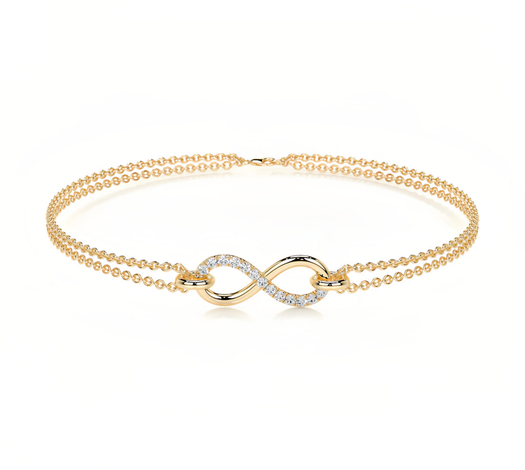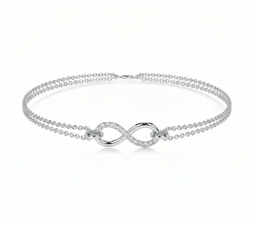 Eternal Elegance Defined Celebrate an infinite connection with our Moissanite Infinity Bracelet. Featuring the iconic symbol of eternity embellished with shimmering Moissanite stones, this double-layered cable chain bracelet offers a delicate yet sophisticated look. It is the ultimate meaningful gift for anniversaries, birthdays, or a stylish daily reminder of love.